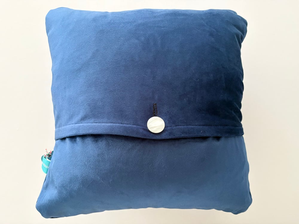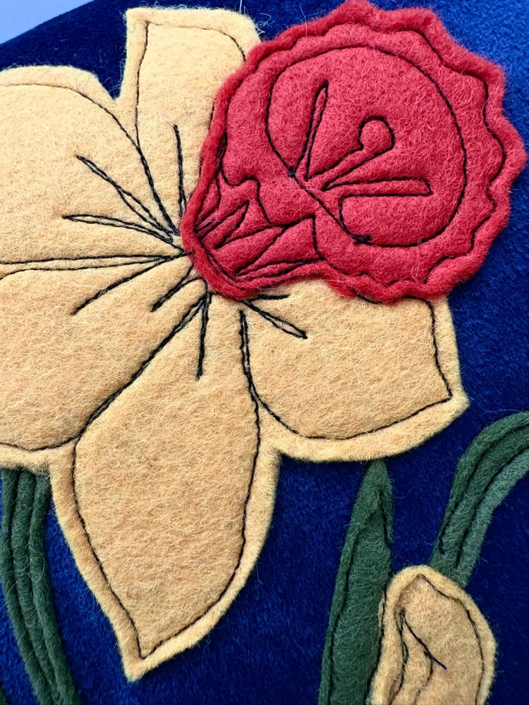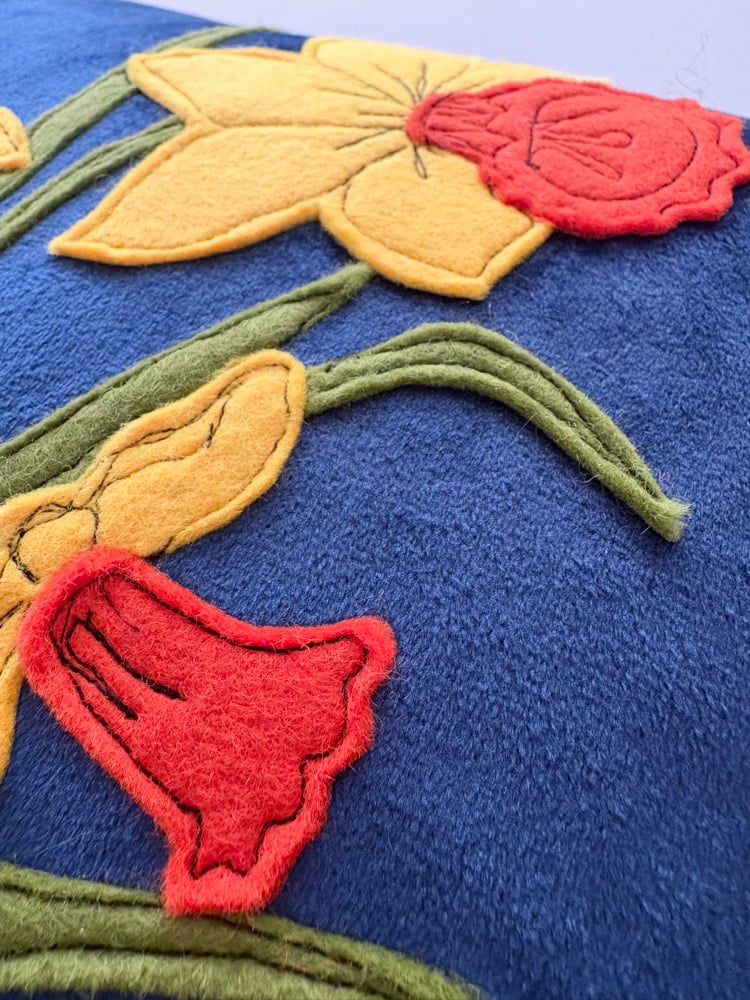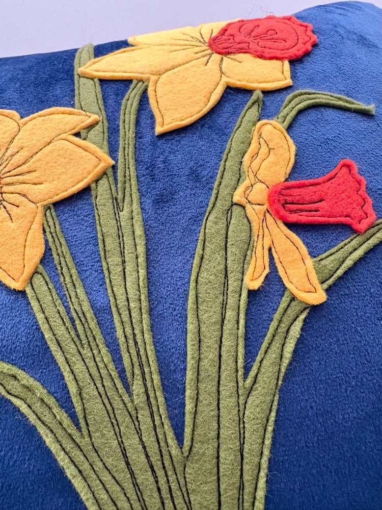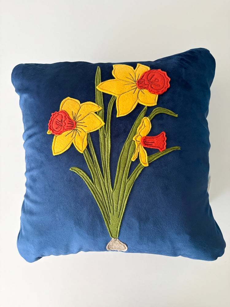 Raggy Roux Stunning handcrafted appliqué daffodil cushion. Super soft velvet deep navy background with beautiful daffodil design. Back of cushion is fastened with large button.