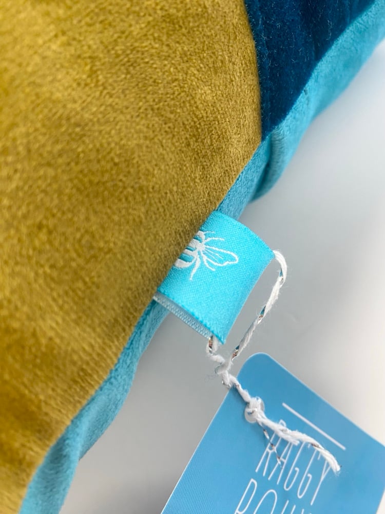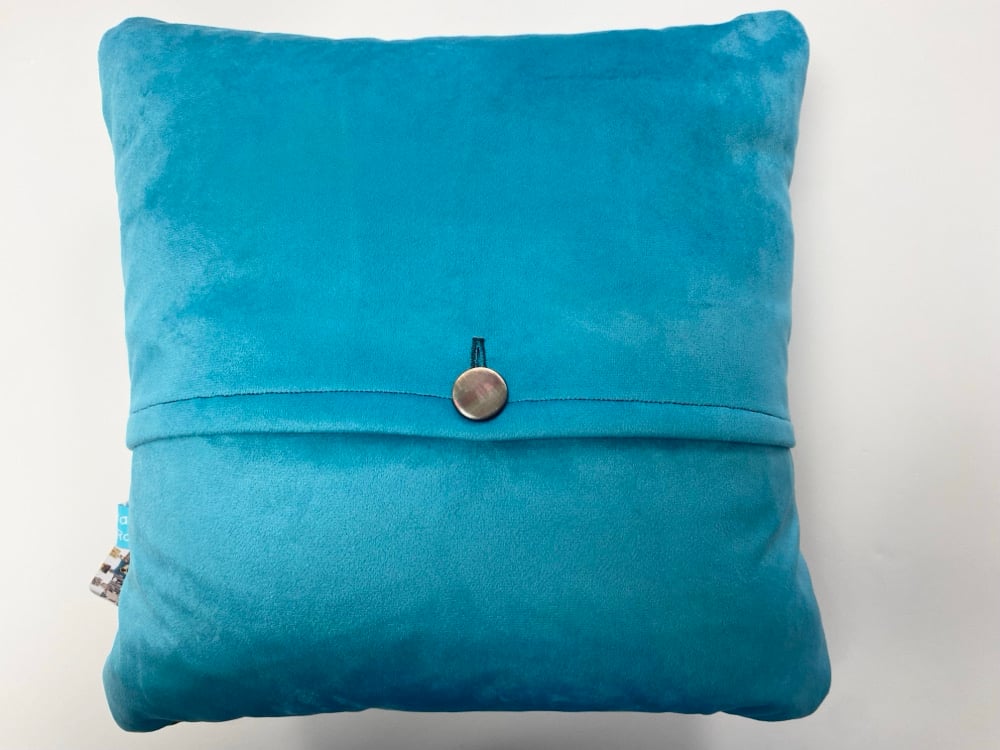 Super soft velvet teal background with quirky seagull and text deign. Back of cushion is fastened with large button.