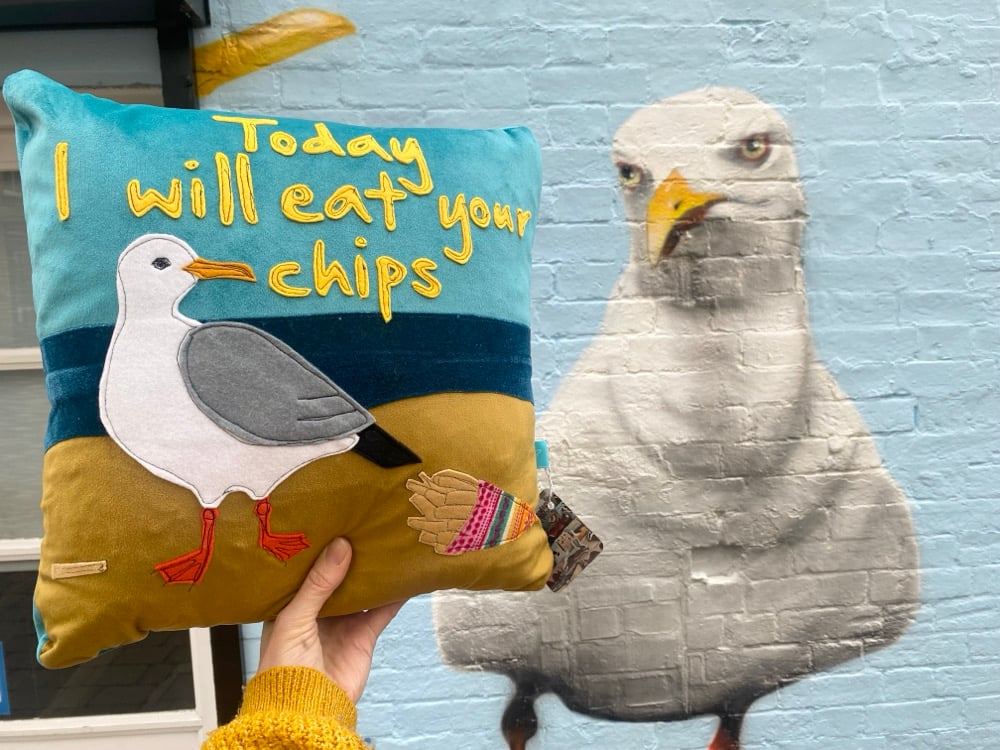 Raggy Roux - ‘today I will eat your chips’ seagull cushion